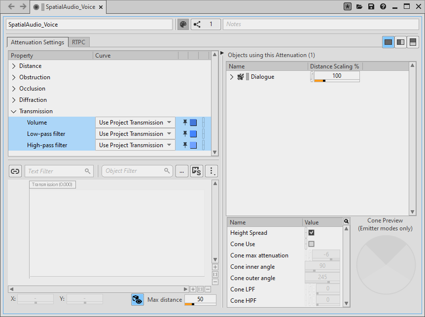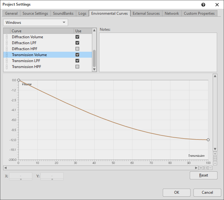 - Adjust the transmission curves in the sound's attenuation, or in the Project Settings. The transmission curves in the Project Settings are used if the attenuation curves are set to "Use Project Transmission", or if the sound doesn't have an attenuation.