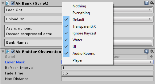 オブストラクションやオクルージョンを、必ず正しいオブジェクトに適用できるように、レイヤーマスクを利用します。例えば、プレイヤーオブジェクトのレイヤを指定し、それを AkEmitterObstructionOcclusion コンポーネントから除外すれば、リスナーのボディが音を邪魔したり聞こえにくくしたりしてしまうのを防げます。