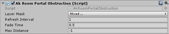 ポータルが接する各ルームの、様々なメッシュで、 AkRoomPortalObstruction コンポーネントでオブストラクションが発生します。サーフェスリフレクタが設定されていれば、それらによってポータルの開口が塞がれる可能性もあります。これらを別のレイヤに入れ、 AkRoomPortalObstruction コンポーネントのLayer Maskから除外できるようにしてください。