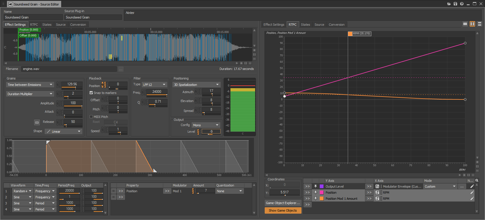 エンジン音を実装するのに、事前にレコーディングして、レコーディングの各リージョンが異なるRPMやエンジンレジームに対応するようにしたものを準備し、インポートすることがあります。そうすると、希望するレジームに対応するファイルの、あるリージョンから、シンセサイザーにグレインをランダムに拾わせることが目標です。ここで、リージョンはマクロウィンドウとみなし、そこからグレインを取得すると解釈できます。このマクロウィンドウを実装する方法の1つが、RTPCの上にグレインモジュレーションを使用する方法です。