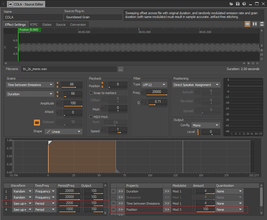 ここでモジュレータのPeriodを小さくすると、Soundseed Grainによるファイルのスキャンが速くなります。もし希望すれば、モジュレータのPeriodに対してRTPCを適用できます。また、別のWaveformも使えます。例えば三角形のLFOは、ピンポン玉のような動きでファイルをスキャンします。