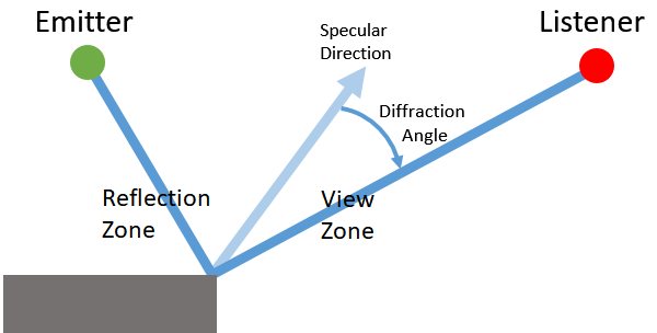 下図をご覧ください。エミッタはリスナーの視界に入っていますが、鏡面反射がリスナーに当たっていません。つまり、ビューゾーンに入っているのです。すでに Diffraction(回折) で説明した通り、回折はビューゾーン内でも発生します。ただしWwise Spatial Audioでは、ダイレクトパスのモデル化を行うRooms and Portalsでもジオメトリによる回折でも、ビューゾーン内の回折が実際のダイレクトパスと比較して無視できる程度なので、考慮されません。しかし反射に関しては、ビューゾーンの回折が劇的な影響をもっています。回折がないとアーリーリフレクションが聞こえるのはリフレクションゾーン内だけで、そこでは純粋な鏡面反射となっています。リスナーがビューゾーンに入った途端、反射が聞こえなくなります。回折を有効にしておけば、エッジが作用して反射波が回折されます。そうすると、リスナーがリフレクションゾーン内を歩き回ったり、そこを遠ざかったりしたときに、追加のフィルタリングや減衰が適用されたあとの反射を聞くことができるのです。