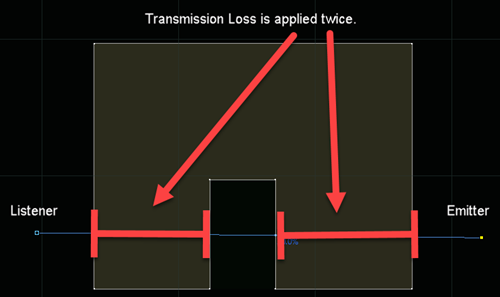音の透過のために、ジオメトリのセットアップで特に必要な追加の手順はありませんが、様々なジオメトリタイプに合わせて透過損失(transmission loss)の係数を調整したほうが良いと思われます。例えばコンクリート構造は、ほぼすべての音響透過を妨げる可能性が高いのに対し、ベニヤ板で構成されたジオメトリは、わずかに音を妨げるだけかもしれません。