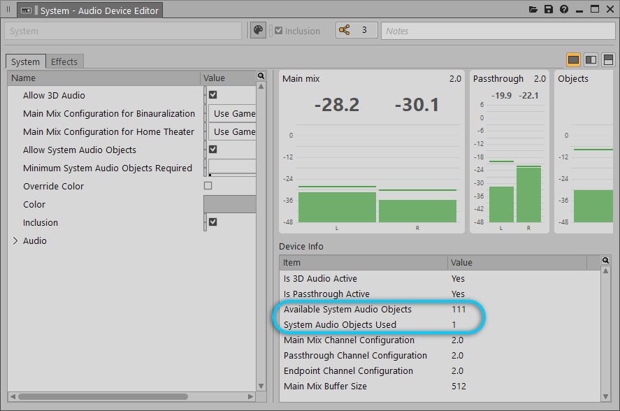 グッドプラクティスとして、 Available System Audio Objectsの上限を超過しないように心がけてください。超過したAudio ObjectがMain Mixに送られると処理が異なってしまう可能性があり、その場合は聞いて分かるほどの差異が生じてしまいます。System Audio Objectは、先入れ先出しの順番でアロケーションされます。 |