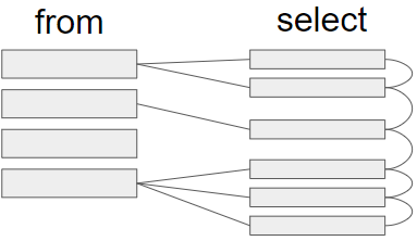 select | select キーワードで、インプットシーケンスにある各オブジェクトについて、オブジェクトシーケンスを生成できます。 例: