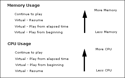 Play from beginning - メモリやCPUの使用量が低いオプションだが、ストリーミングのサウンドの場合、バーチャルボイスから戻る時にディレイが起きる可能性がある。