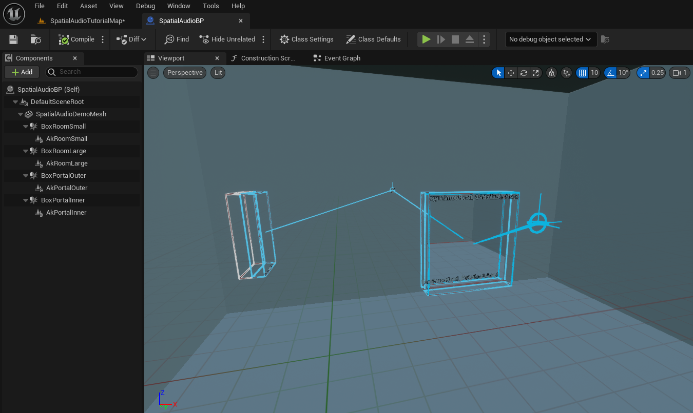 これまで、ビルド済みのアクターを使ったり、個別のアクターインスタンスにコンポーネントを追加したりして、全てのものをレベルに直接つくり込んできました。スペーシャルオーディオの各種コンポーネントを使ってブループリントアクターをつくり、レベルのいたるところで複製することも可能です。このセクションでは、 Wwiseプロジェクトの準備 セクションのストラクチャの複製を、ブループリントクラスを使ってビルドし、ワールドのどこにでも簡単に追加したりスポーンしたりできるようにします。