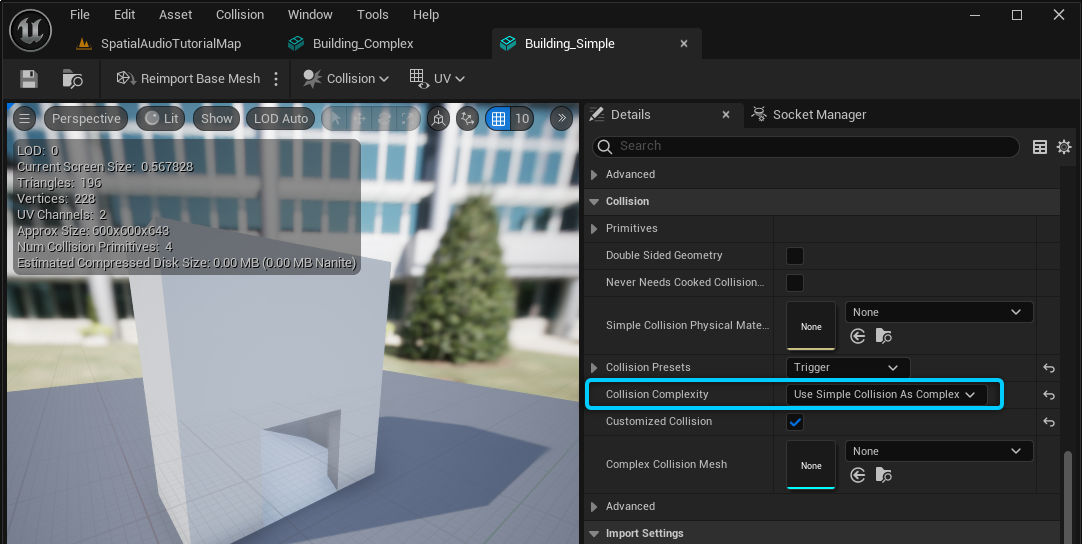 Building_Complex has Collision Complexity set to 'Use Complex Collision As Simple' which means Unreal will not generate any simplified geometry for this mesh, and will instead use the entire trimesh. This is what allows the character to walk through the doorway opening. Building_Simple has Collision Complexity set to 'Use Simple Collision As Complex' which means Unreal will generate simplified geometry and ignore the trimesh. This is what allows Spatial Audio to perform containment tests for room containment.
