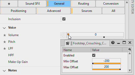 To further avoid repetition, volume and pitch is randomized each time a new footstep is played. To see the random ranges, double click on the volume or pitch randomizer icon on the top-level Switch Container named “Footstep_Types”.