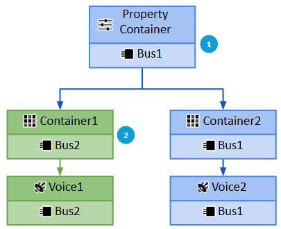 Object Property Container sets the Output Bus to Bus1, setting the Output Bus for descendants that do not override it (i.e., Container2 and Voice2). |