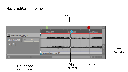 Music Segment Editorでは、タイムラインに沿って、ミュージッククリップがトラック内に表示されます。タイムラインと、波形自体を見ながら、ミュージックのトランジション、State変更、スティンガーなどにとって最適なセクションを確認します。タイムライン上の正確な位置に、エントリキュー、エグジットキュー、そして無制限の数のカスタムキューを、配置できます。