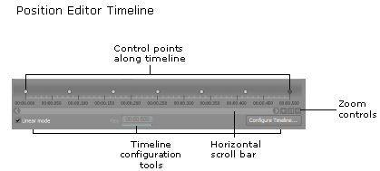 Wwiseには、それぞれ特徴のある3種類のタイムラインがあるので、個別に説明します。Position Editor (3D Automation)でグラフビューにコントロールポイントを追加すると、そのポイントがタイムラインにも表示されます。タイムラインには、各コントロールポイントが時間的にどの位置になるのかが表示されます。ポイントの位置を、空間と時間の両方で設定することで、サウンドのポジションと、サウンドがパス(軌跡)上を移動するのにかかる時間を、決めることができます。Position Editor (3D Automation) のタイムライン表示の内容を、下図に示します。