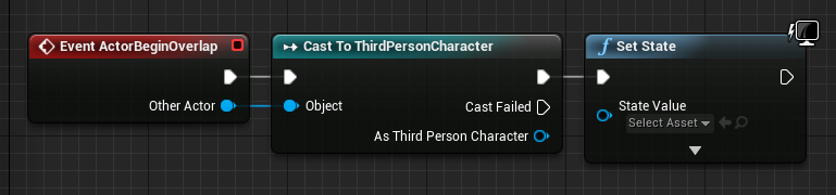 ActorBeginOverlap から、 ThirdPersonCharacter に対してキャストし、ExecをSet State関数に接続します。