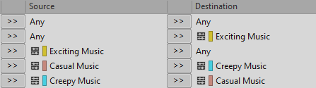 ソース(Source)やデスティネーション(Destination)としてAnyまたはNothing が設定されているトランジションは、具体的なミュージックオブジェクト名が入ったトランジションよりも、上に配置します。こうすれば、Wwiseが、汎用性のあるルールよりも先に、具体的なルールを見つけます。