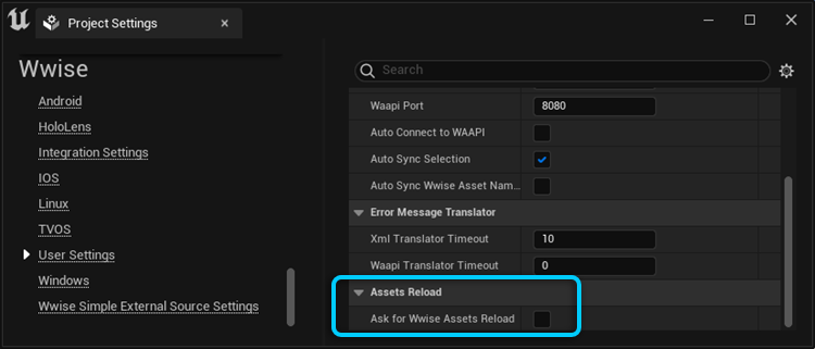 To avoid reloading in-memory assets every time you change the contents of the GeneratedSoundBanks folder, you can select an option in the Unreal Project Wwise User Settings to enable a prompt before assets are reloaded. When this setting is enabled, Wwise assets can only be reloaded with explicit user input except during the initialization of the Wwise Project Database when the Unreal editor is opened.