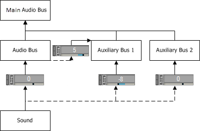 次のイラストは、AUXセンドの減衰量が5 dBで、AUXセンドが2つあるAudio Busにルーティングされたサウンドを示しています。どちらのAUXセンドもボリューム減衰があり、Auxiliary Busにルーティングされます。