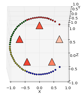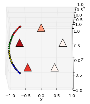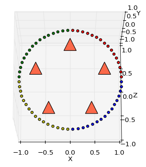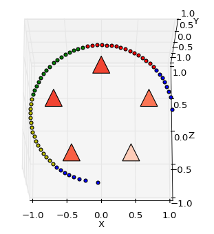 エミッタの相対的なポジションと、エミッタの相対的な向きの違いを明確にするために、エミッタの相対的なポジションが45°、エミッタの相対的な向きが90°、Spreadが70%の場合の結果を下図に示します。これは、リスナーがエミッタの音場に南西から突入して、その向きが東向きである場合を表しています。緑と赤のエミッタチャンネルがリスナーのおおよそフロントレフトとフロントライトに位置して、青のチャンネルが周囲を囲み始めている様子が分かります。