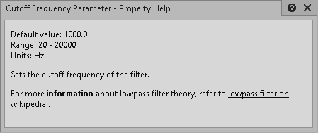 以下は、Cutoff Frequency ParameterプロパティのHelpファイルの例と、それがWwiseのProperty Helpビューに表示された様子です: