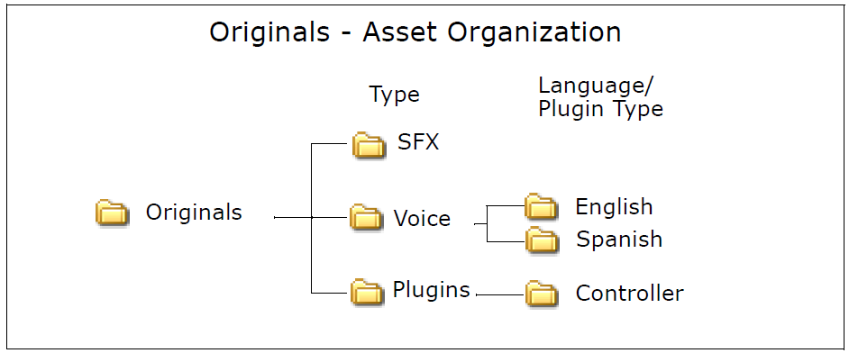 [Voice]または[Plugin]ファイルとしてフラグが立てられたファイルは、言語やプラグイン種別でさらに分類されます。下図は、プロジェクトにインポートされたオリジナルのアセットがWwise内でどのように整理されるかを示します。