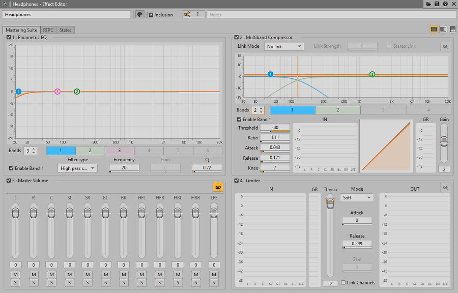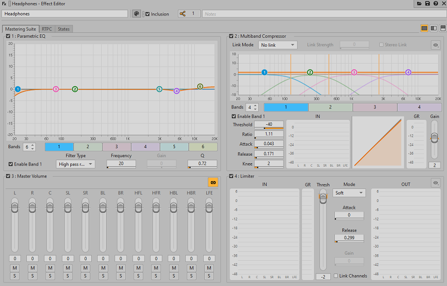 コンフィギュレーション: Parametric EQはアクティブでバンド数6、Compressorはアクティブでバンド数4、Volumeはアクティブ、LimiterはアクティブでもモードはSoft。