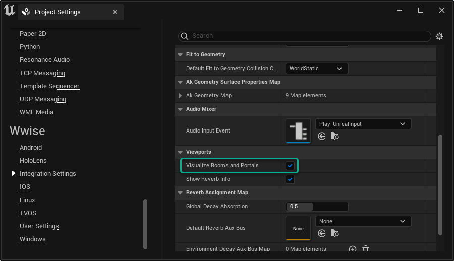 You can view Rooms and Portals in the Viewport to adjust their positions, and to visualize Portal-Room connections. You can enable or disable visualization from the Wwise Integration Settings under Viewports - Visualize Rooms and Portals. You can also toggle this setting directly from the Unreal Level Editor Viewport menu.