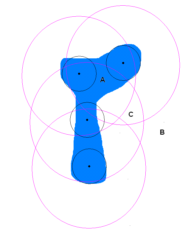 次の例では、黒い点がサウンドの最初のポジション、黒い円は減衰と拡散(スプレッド)の最小距離を、ピンクの円は最大半径を表しています: