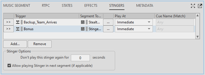 Stingers(スティンガー)タブで、Triggerリストを作成してから、これらのTriggerで再生させるセグメントをアサインして、再生するタイミングを指定します。また、Stingerごとに、再生(Play)オプションも設定できます。