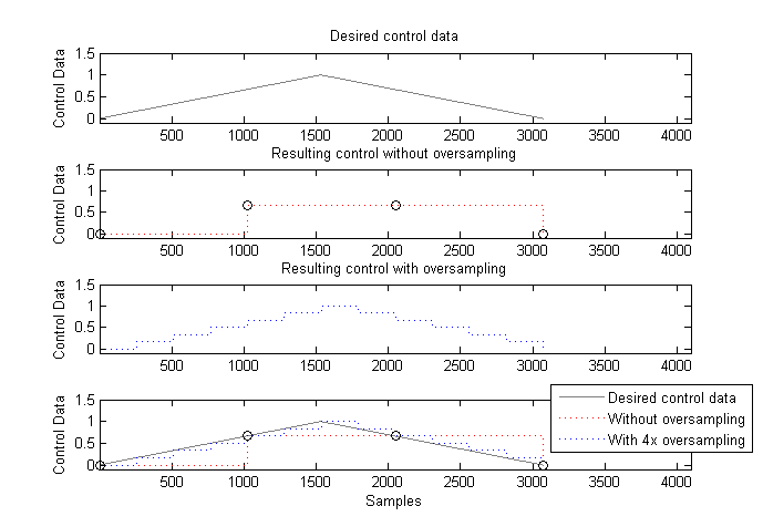 オーバーサンプリングを、実際の制御カーブをより良く表せる目的で、制御レートに影響を与えるために使用した例を、下図に示します。