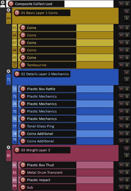 Composite Collect Lootトラックではさまざまなタイプのレイヤーを組み合わせています。以下のようにトラックはレイヤー別にカラーコードで色分けされています: