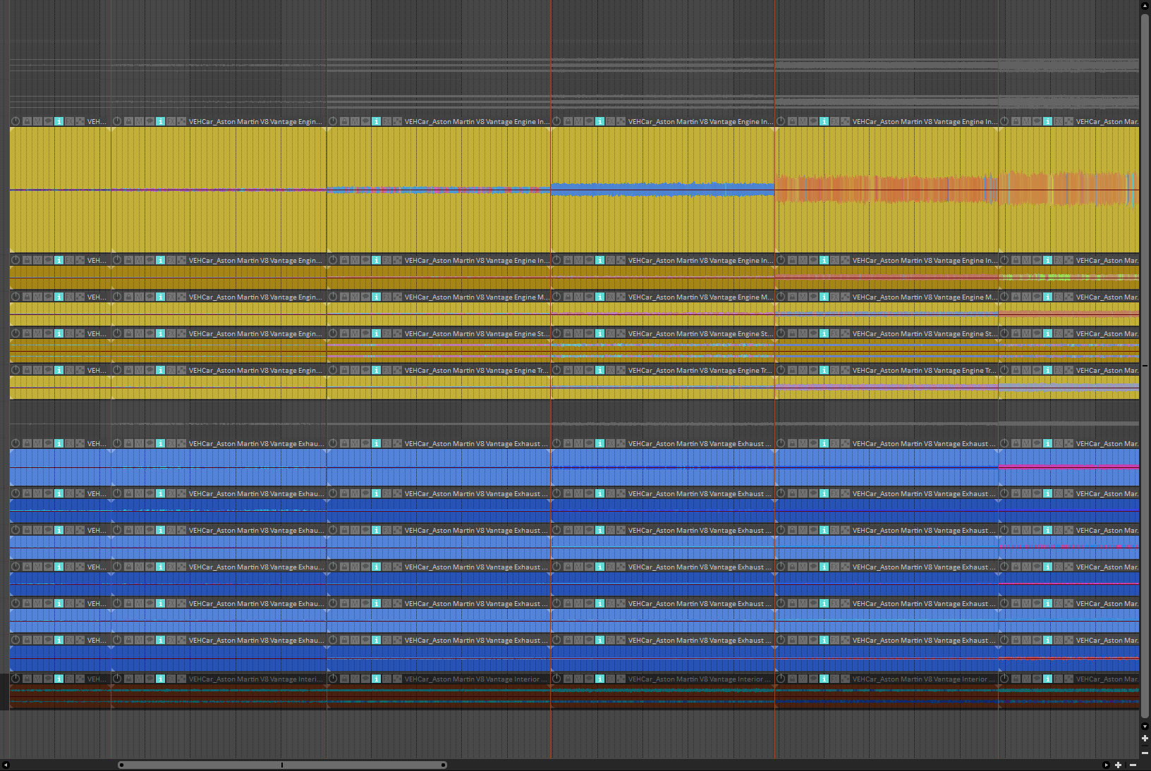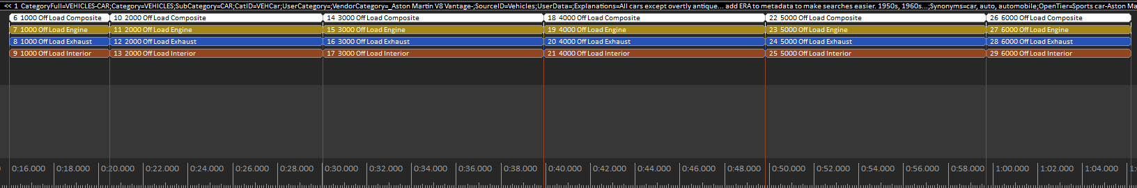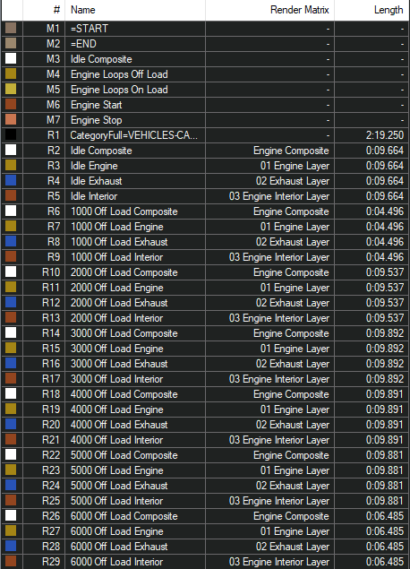 Vehiclesコレクションは車両エンジン音のリアルタイムオーディオレンダリング用に構築されています。リージョンの多くはシームレスにループするように設定してあり、オンロード(on load)とオフロード(off load)の安定した状態のRPMを、そのエンジンの範囲全体にわたり収録しました。各revループ範囲の各レイヤーに変更可能な特定のリージョンがあり、これを変更してもほかのレイヤーとの同期が維持されます。レイヤーのレンダリングや名前は事前に設定されています。これらの機能や既定の設定を利用して、ランタイムに非常に柔軟なエンジンモデルを実装することができます。