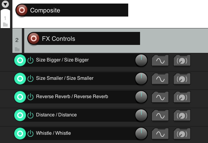 FX Controlsトラックは個々のレイヤートラックの出力に影響を与えます。同時に複数のパラメータを制御します。個々のパラメータは設定した範囲内で適用され、FX Cotrolsには自動化することのできるエンベロープがあります。トラックの名前はトラックを操作した結果もたらされる全体的なエフェクトを示しています。1つの制御を通して複数のサウンドの複雑で重要な編集が可能です。コントロールトラックのカラーはグレーで、個別のエンベロープコントロールトラックは濃いグレーです。