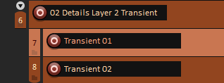 Transientレイヤーはサウンドの最も近く最も攻撃的な部分です。接近感を出すためにタイミングを変更して爆発音の特徴全体を変えることができます。Details Layer 2のトラックはすべてオレンジのカスタムカラーとし、薄い色と濃い色を交互に使用します。