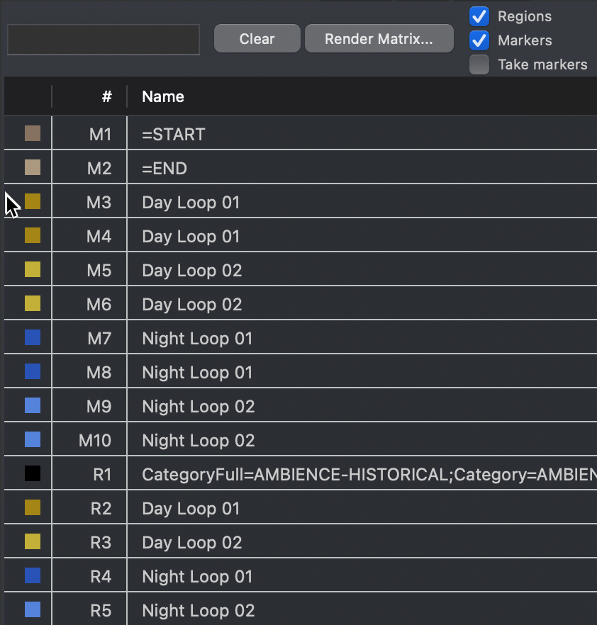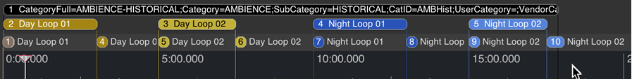 ループごとにリージョンがあり、対応する黒のデータリージョンもあります。1つのアンビエンスの日中と夜間のリージョンのバージョンが、サブプロジェクトのデザインの一部としてあるサブプロジェクトもあります。