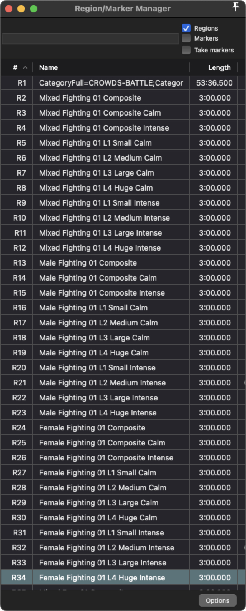 Combat Wallaサブプロジェクトのリージョンは、Region/Marker Managerと、タイムラインの上にあるRegion Trackに表示されます。