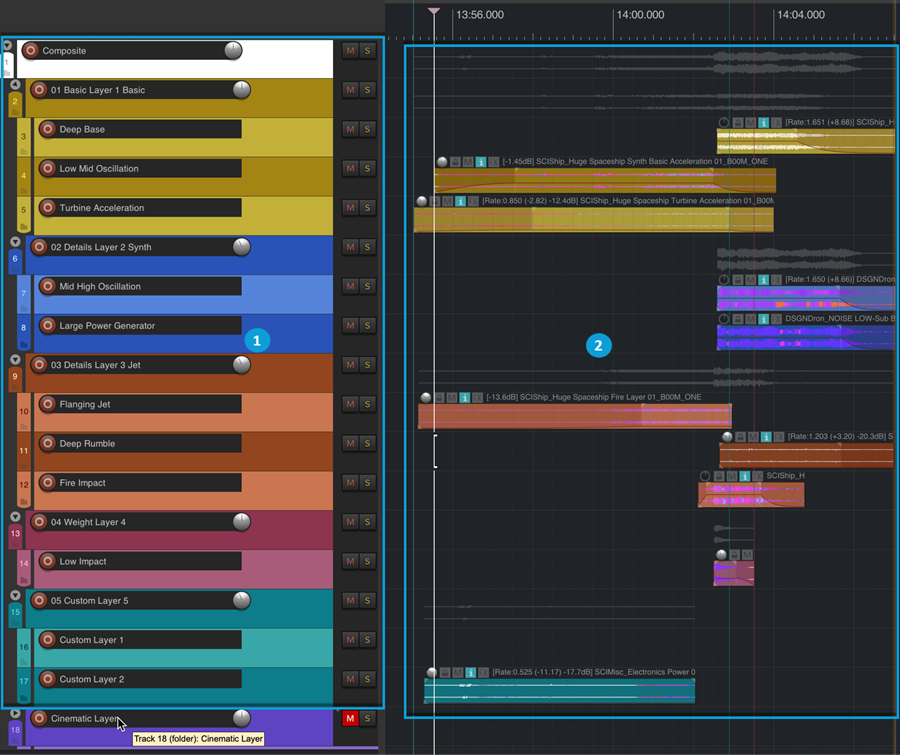 下図はSpaceshipsプロジェクトの典型的なサウンドを示したものです。リージョンとレイヤーの関係がカラーで分かります。