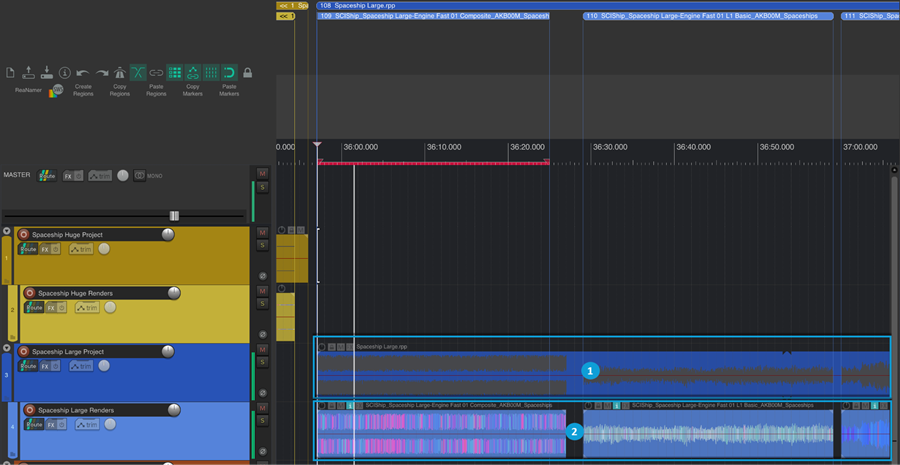 Spaceshipsのトラック、レイヤー、リージョンはStrataの標準カラーと階層を使用します。Strataコレクションのプロジェクトはいずれもメインプロジェクトやサブプロジェクトのトラックレイアウトが似ています。