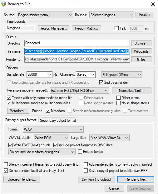 どのコレクションにおいてもサブプロジェクトにRenderedフォルダがあり、全リージョンのレンダリング後のオーディオファイルがここに含まれます。レンダリング後のWAVファイルはBWFフォーマットで、サンプリングレートは96 kHz、デプスは24bitであり、組み込みメタデータも豊富にあります。