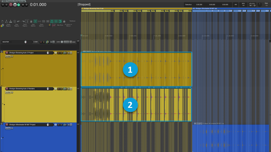 WWI Firearms Pistolsメインプロジェクトを使い、効率的にWWI Firearms Pistolsコレクションのサウンドを可視化、検索、試聴することができます。メインプロジェクトはライブラリの中心的な役割を担い、ここからライブラリの各サブプロジェクトを開くことができます。サブプロジェクトには特定の銃器に関連するサウンドが含まれ、銃器の型や名前で整理されています。メインプロジェクトに各サブプロジェクトの銃器のトラックが含まれ、メディアアイテムはネスト化されたトラックの各種サブプロジェクトを参照します。メディアアイテムを自由に試聴することができ、メディアアイテムは該当するサブプロジェクトのレンダリングされた出力を参照します。