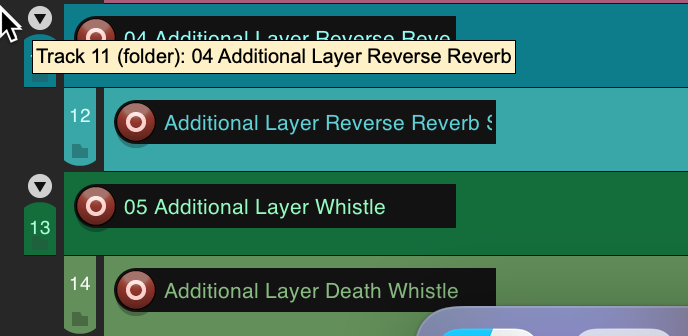 Detailsレイヤーは生物の声に最も接近した時の詳細な部分で、舌を鳴らした時の唾液のねばりつく音や喉の奥が鳴る音などです。接近感を出すためにタイミングを変更して特徴全体を変えることができます。Details Layer 2のトラックはすべてブルーのカスタムカラーとし、薄い色と濃い色を交互に使用します。