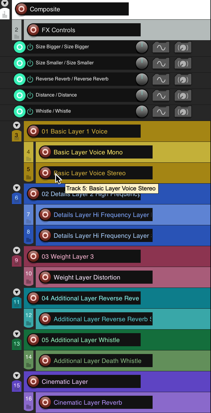 Basic Layerは生物の決定的な特徴を表すものです。これ単体を標準的な距離サウンドエフェクトとして使用することも可能です。Basic Layerのトラックはすべてイエローのカスタムカラーとし、薄い色と濃い色を交互に使用します。