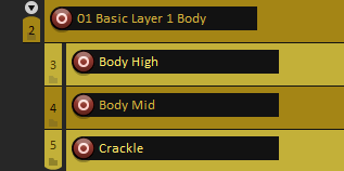 Basic Layerは爆発の決定的な特徴を表すものです。大きさ、種類、機能などを表現するために役立ちます。これ単体を標準的な距離サウンドエフェクトとして使用することも可能です。Basic Layerのトラックはすべてイエローのカスタムカラーとし、薄い色と濃い色を交互に使用します。