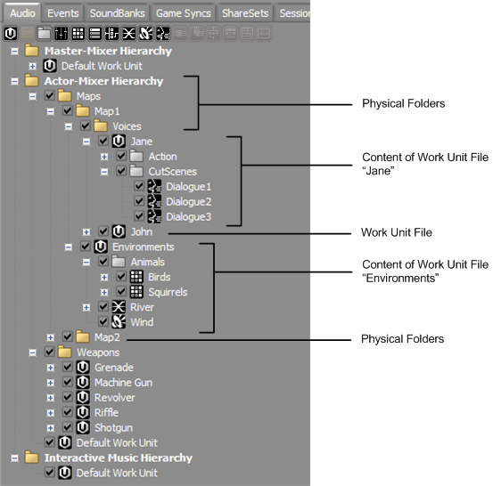 다음 예시는 Work Unit을 만들어서 Actor-Mixer Hierarchy의 사운드 구조를 나누어 넣도록 구성하는 방법을 보여줍니다.