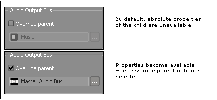 절대적 속성은 자동적으로 각 상위 오브젝트에서 하위 오브젝트로 전달되기 때문에 최상위 계층에 설정해야 합니다. 특정 오브젝트에 다른 속성값을 지정해야 할 경우 상위 계층의 속성을 새로운 값으로 덮어쓸 수 있습니다. 기본적으로 절대적 속성은 하위 오브젝트에서는 사용할 수 없지만 Override parent 옵션을 선택하면 사용 가능합니다.