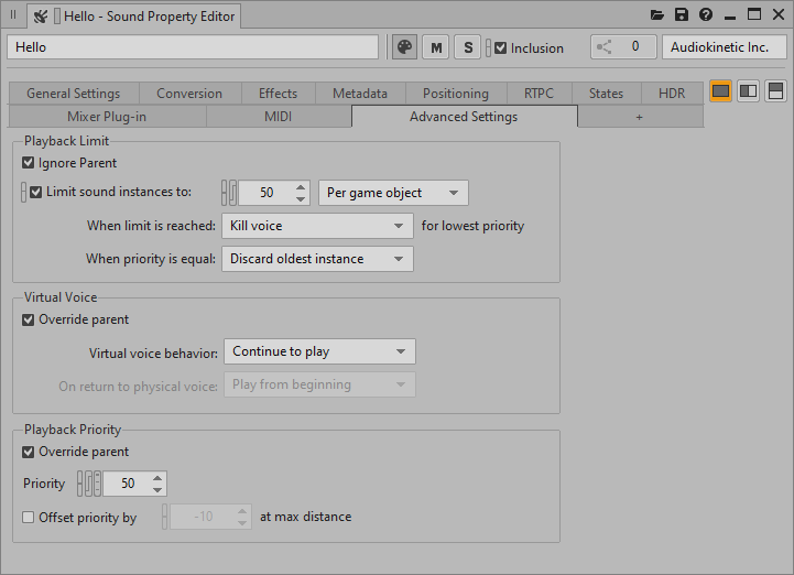 사운드 구조의 고급 설정은 오브젝트 Property Editor의 Advanced Settings 탭에서 지정됩니다. 고급 설정을 통해 동시에 재생할 사운드 개수의 제한과 더 이상 들리지 않을 경우의 작동 방식을 지정할 수 있으며, 각각 다음과 같은 장점을 가져다 줍니다.