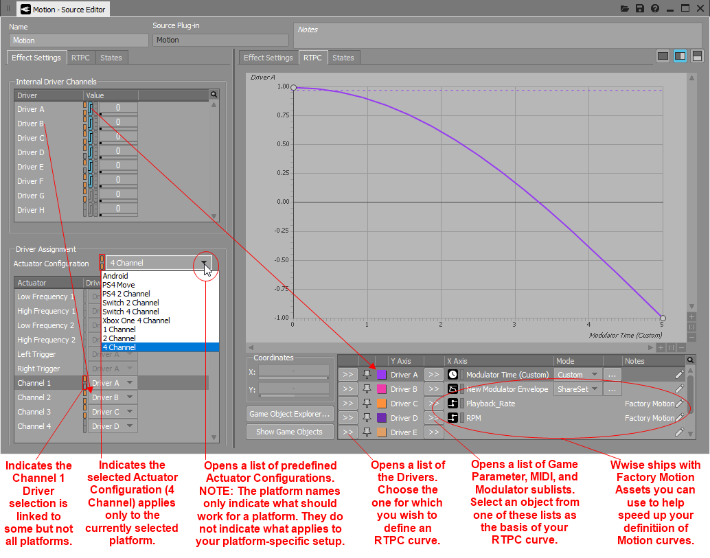 RTPC와 함께 이 플러그인을 사용하면 최대 여덟 개의 다른 Driver로 모션 강도와 지속 시간을 지정할 수 있습니다. 이러한 Driver는 여러 가지 구성의 여러 다른 액추에이터 (모터)에 적용될 수 있습니다. 표준 Wwise 플랫폼 연결을 사용하면 모든 Driver, Actuator Configuration, 각 Actuator를 플랫폼마다 다르게 설정할 수있습니다.