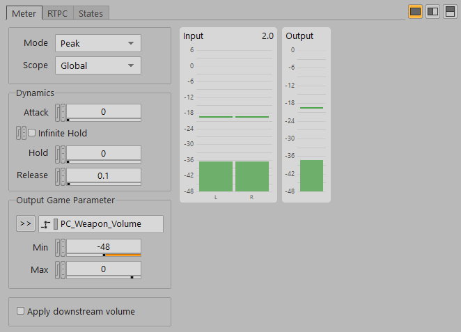 Meter Effect는 입력 오디오 신호를 모니터링합니다. 이 Effect를 사이드 체인에 사용하면 Mode, Attack, Release, Hold 매개 변수를 사용하여 출력 신호의 반응 속도를 조절하고 평활된 값을 게임 매개 변수(이 경우 PC_Weapon_Volume)에 전달하게 됩니다.