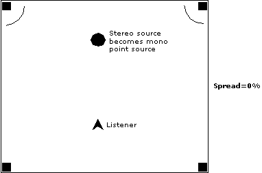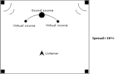 리스너가 음원에 가까이 있을 경우 소리가 특정 위치에서 발생하며 (공간화) 거의 최대 볼륨으로 재생됩니다 (감쇠). 확산값이 클 경우 소리는 모든 방향에서 들리게 됩니다. 스테레오의 좌우 채널은 별도로 확산됩니다.