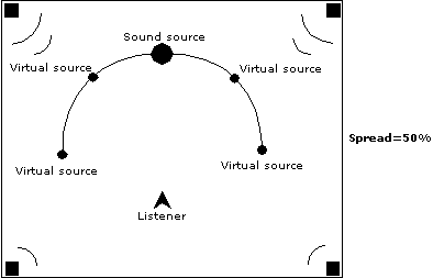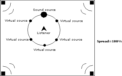확산값이 증가하면 이러한 가상 음원이 더 생겨서 리스너 주위를 더 넓은 범위로 다루게 됩니다. 물론 전체 파워를 일정하게 유지하기 위해서 이러한 가상 음원의 파워는 실제 음원보다 작습니다.