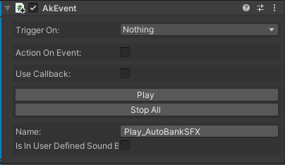 를 호출하면 언제든지 Event를 설정할 수 있습니다. 또한 직접 만든 트리거 코드를 작성하여 자신의 동료들이 목록에서 볼 수 있게 할 수도 있습니다. Wwise 이벤트에 새로운 트리거 추가하기 를 참고하세요.AK::SoundEngine::ExecuteActionOnEvent