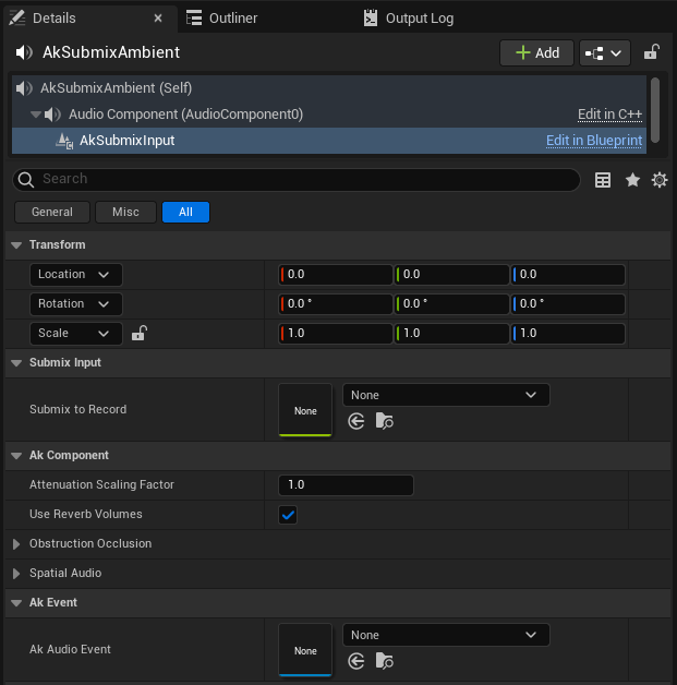 AkSubmixAmbient Blueprint의 루트 컴포넌트에 AkSubmixInput 컴포넌트를 추가하세요.